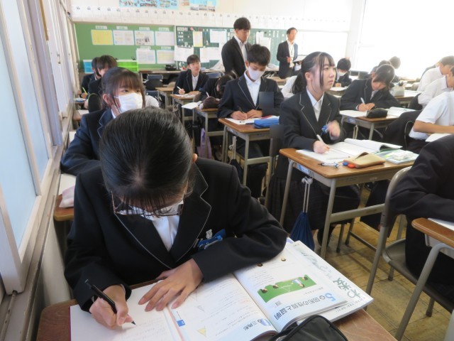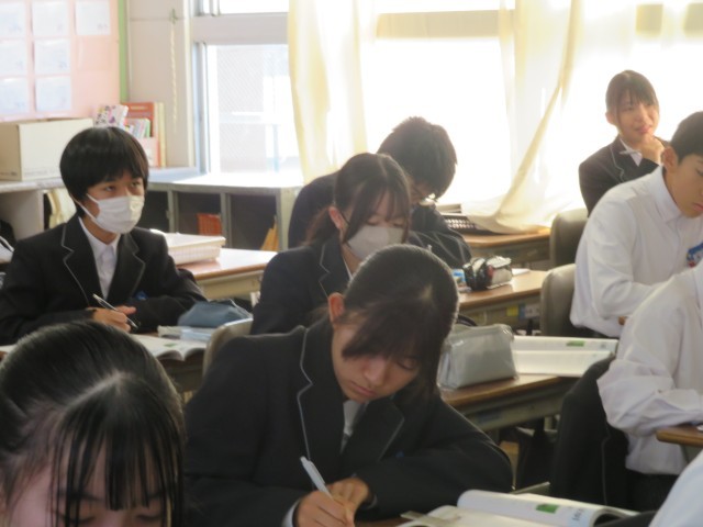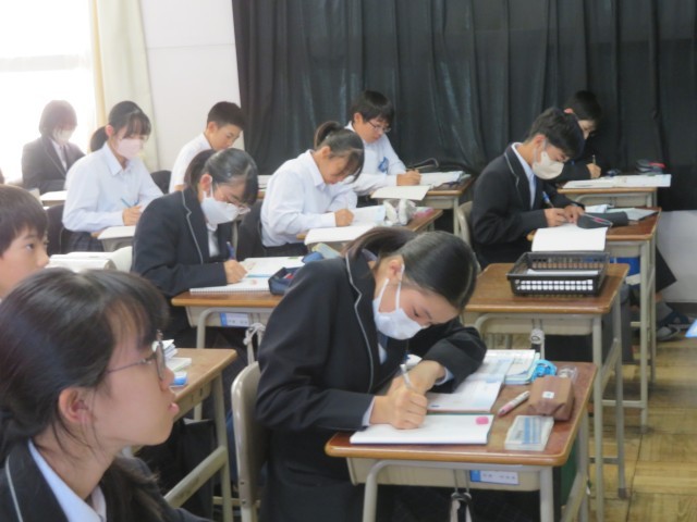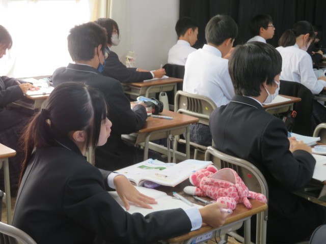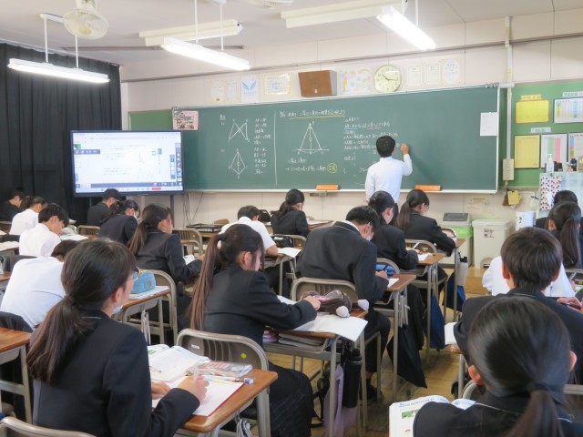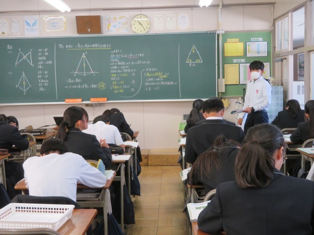 2年生の数学の授業のようすです。「二等辺三角形の性質を証明しよう」というめあてで学習を進めていました。三角形の合同を利用して、二等辺三角形の性質がいつも言えることを証明することができましたね。