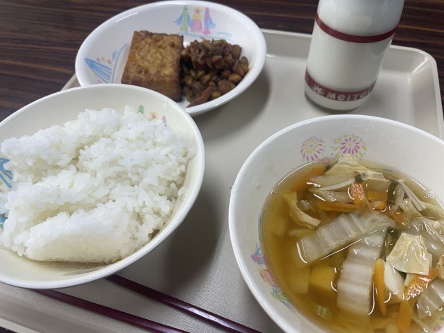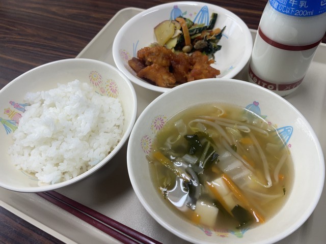 今日の給食のメニューは、ご飯、牛乳、ヤンニョムチキン、まごはやさしいナムル、ワンタンスープでした。