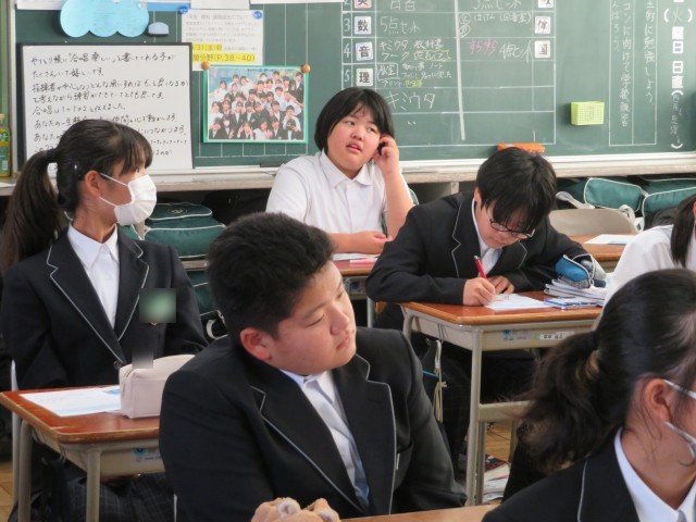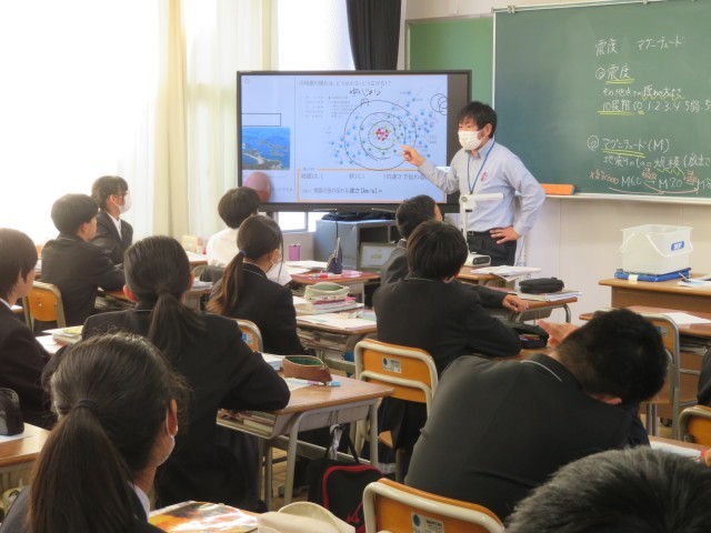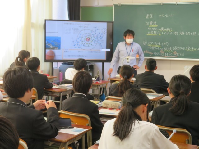 1年生の理科の授業のようすです。震度とマグニチュードについて学んでいました。震度とマグニチュードは、どちらも地震の大きさを示す指標ですが、表している「大きさ」が根本的に異なります。違いが説明できるようになりましたね。