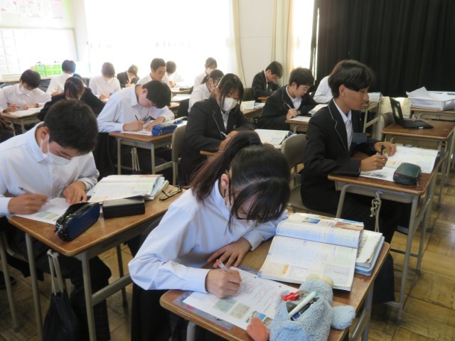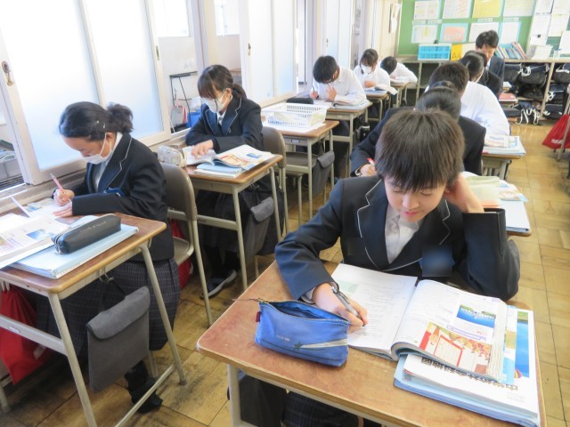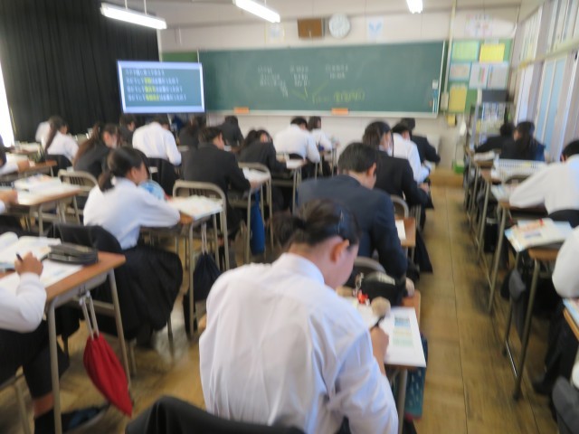 2年生の教育実習生の社会の授業のようすです。「どうして学制は必要だったのか」「どうして徴兵令は必要だったのか」「どうして地租改正は必要だったのか」ペアで話し合う前に自分の考えを一生懸命まとめていました。