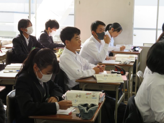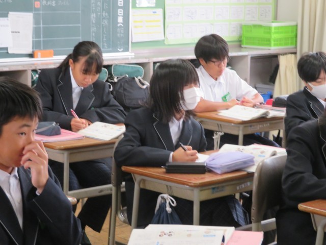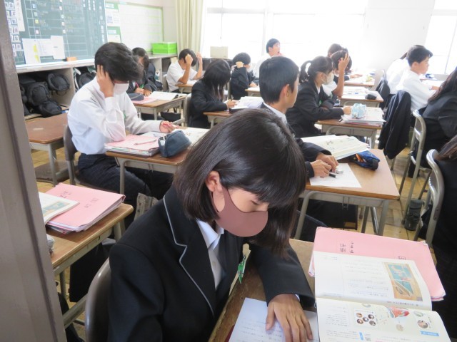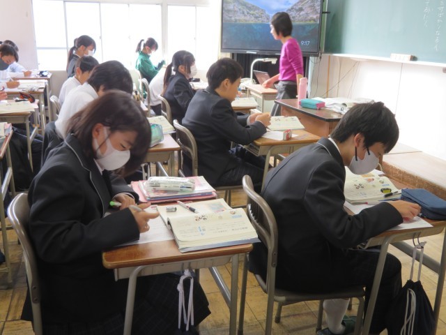 1年生の国語の授業のようすです。「『竹取物語』の冒頭をすらすら読もう」というめあてで学習を進めていました。『竹取物語』の冒頭は「今は昔、竹取の翁といふものありけり。」から始まります。文章をすらすら読むためのポイントは、歴史的仮名遣いと句読点(特に「、」)の打ち方を意識することですね。すらすら読めるように繰り返し頑張りましょう!