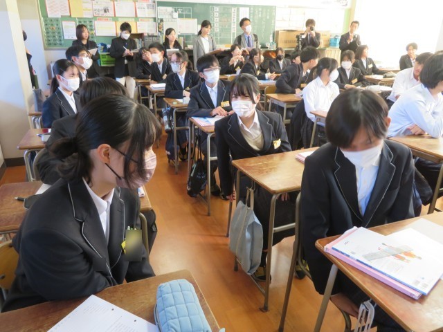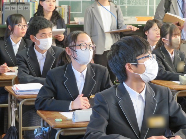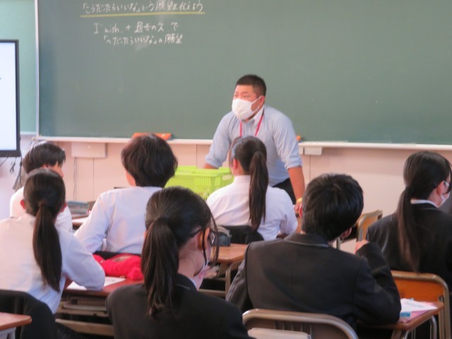 今日の午後は、市内の先生方にも参加していただき、中部中学校で現職教育授業法研究会を行いました。多くの生徒が下校した後、先生たちが3つの教室に分かれて研究授業を参観し、その後研究協議、研究全大会を行いました。写真は、3年生の代表クラスの6組の社会の授業のようすです。「I with (that)~」の表現を使って、「『こうだったらいいな』という自分の願望を伝えよう」というめあてで、学習を進めました。スライドを使っていろんな場面で表現が使えるように練習したり、アフガニスタンの抱える問題について自分たちにできることを学んだ表現で英文をつくったりしてめあてにせまっていきました。一通りの答え方ではなく、過去の学びも使って様々な表現方法を考えるところがすばらしかったです。さすが3年生ですね(^^)/