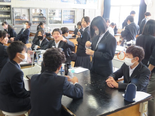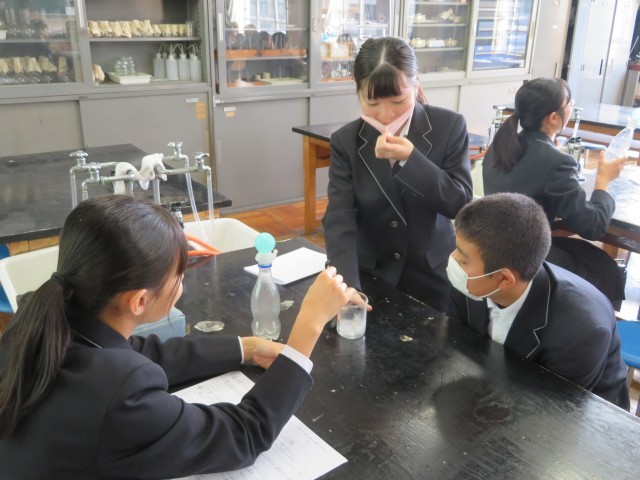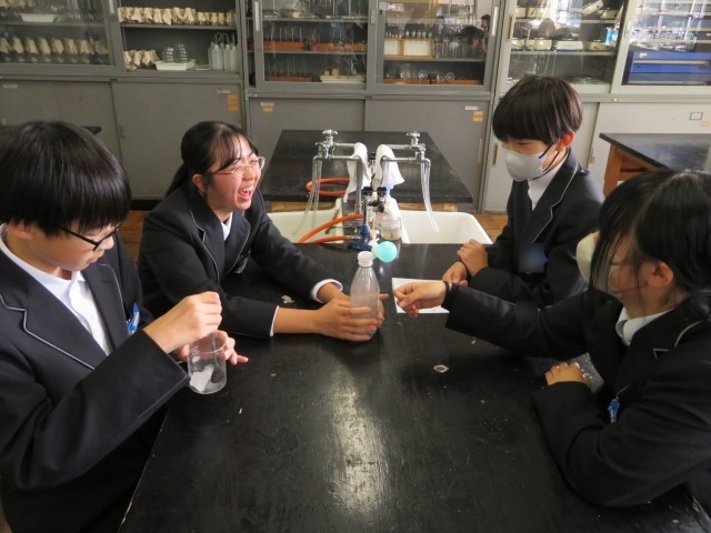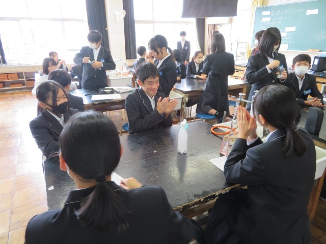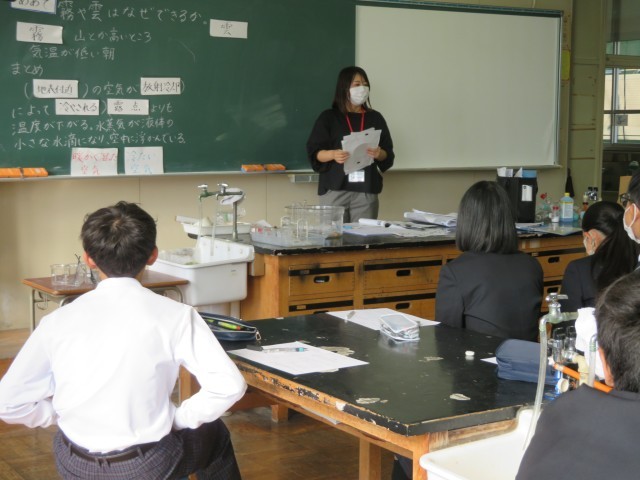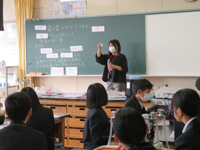 2年生の理科の授業のようすです。「雲や霧はなぜできるのか考えよう」というめあてで学習を進めていました。実験で雲や霧を見事つくることができて歓声が上がっていましたね。さてその原理を説明できるようになったかな。