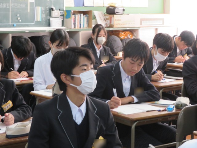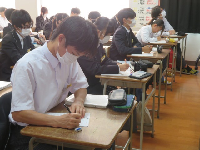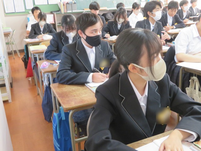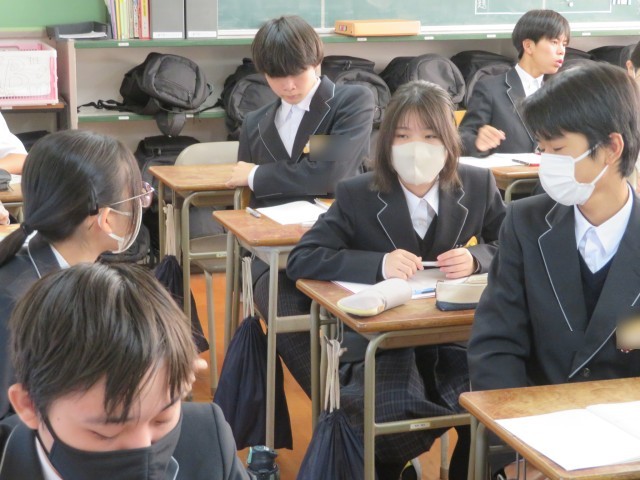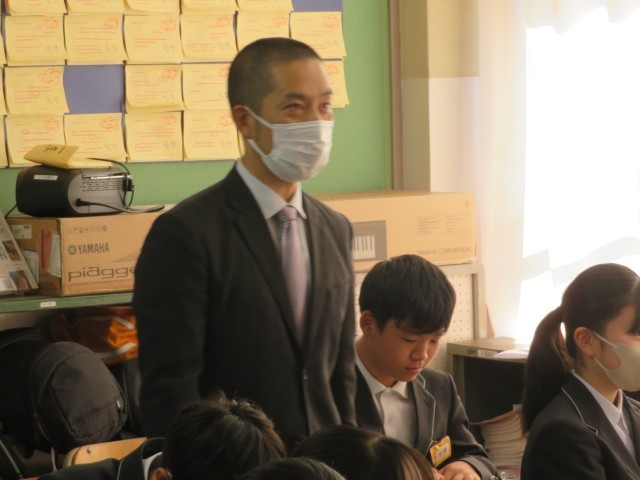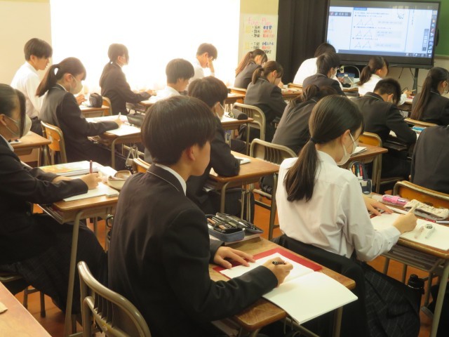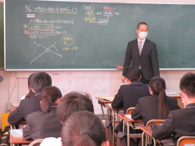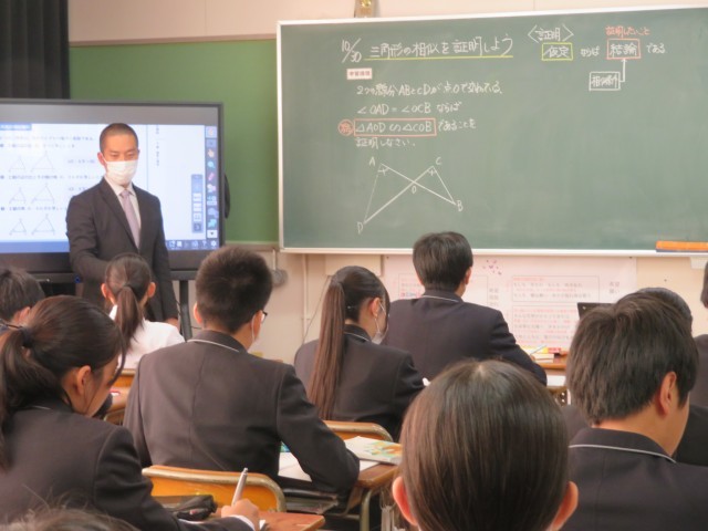 3年生の数学の授業のようすです。「三角形の相似を証明しよう」というめあてで学習を進めていました。2年生で学んだ合同の証明のように、図形の性質について仮定やすっでに明らかになっていることを根拠にして説明できるように頑張っていきましょう(^^)/