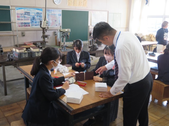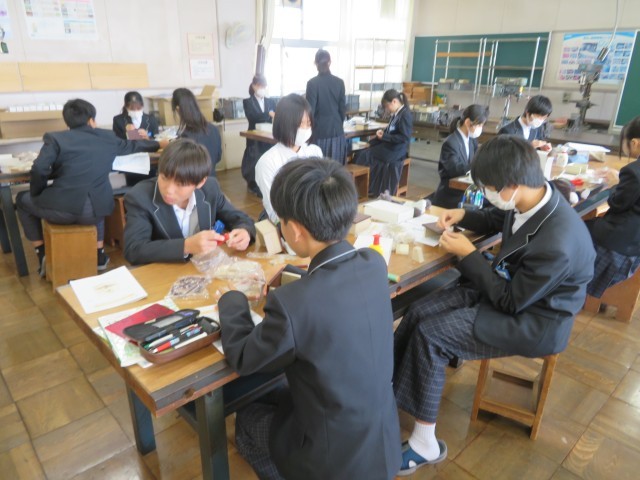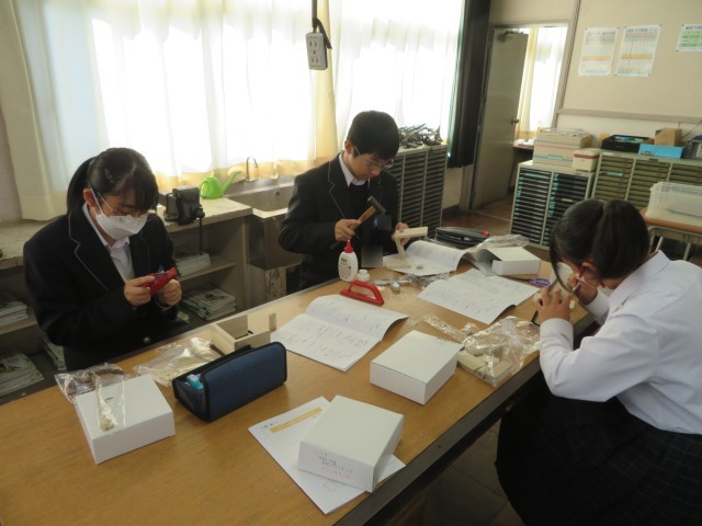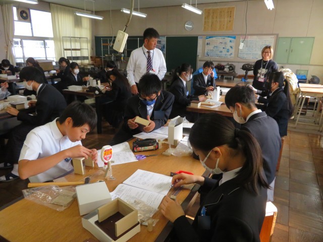 2年生の技術の授業のようすです。「回転運動を伝える仕組みについて知ろう」というめあてで学習を進めていました。オルゴールの製作にも取り掛かりました。完成が楽しみですね。
