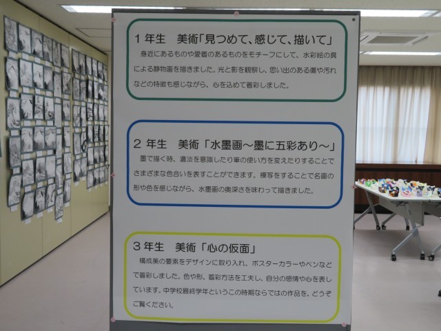 今日から11月7日までの期間(平日のみ)で中部中学校の文化作品展が多目的室で始まりました。写真は各学年の美術の時間につくった作品です。また、南舎とアリーナをつなぐ渡り廊下には、各学年が総合の時間に作った作品が紹介されています。学校公開に合わせてぜひ鑑賞していただけるとうれしいです。みなさんの来校をお待ちしています(^^)/