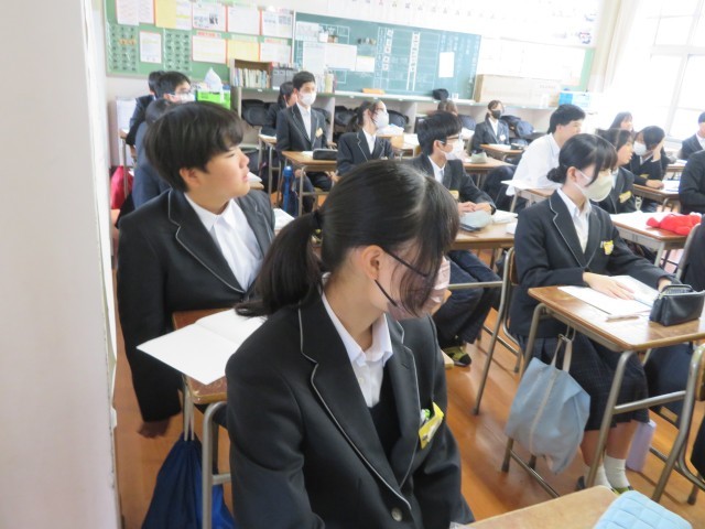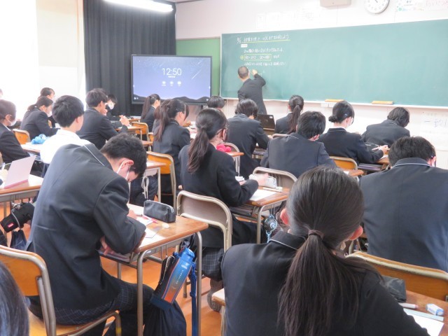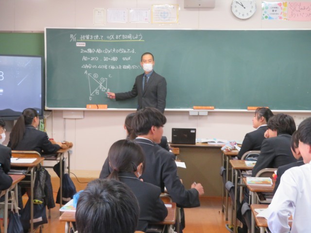 3年生の数学の授業のようすです。「性質を使って、+αまで証明しよう」というめあてで学習を進めていました。今まで学習した図形の性質をヒントにして相似の証明を考えることができましたね。