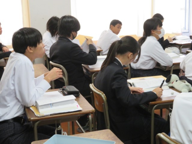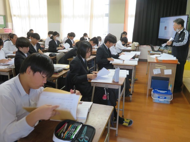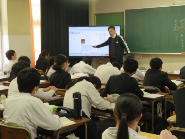 3年生の国語の授業のようすです。松尾芭蕉作「おくのほそ道」の原文を読んで、現代語訳を考えていました。