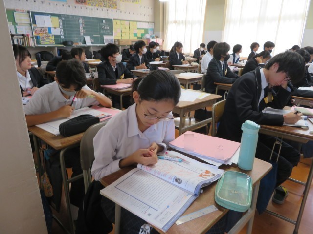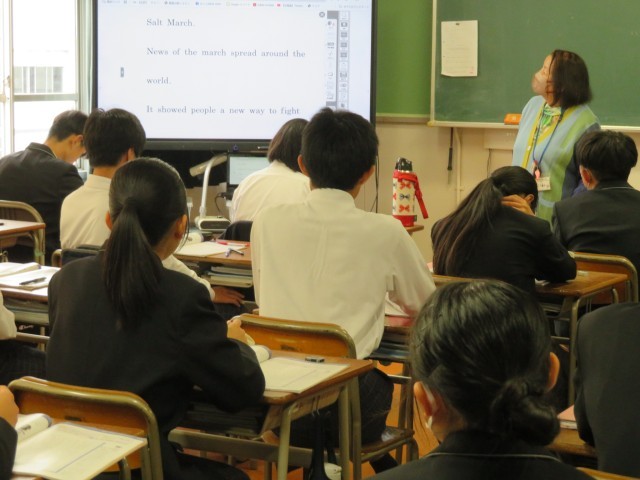 3年生の英語の授業のようすです。ガンジーの伝記について書かれた英文について、読み取りや表現の確認をしていました。