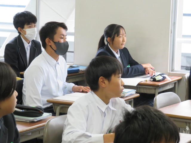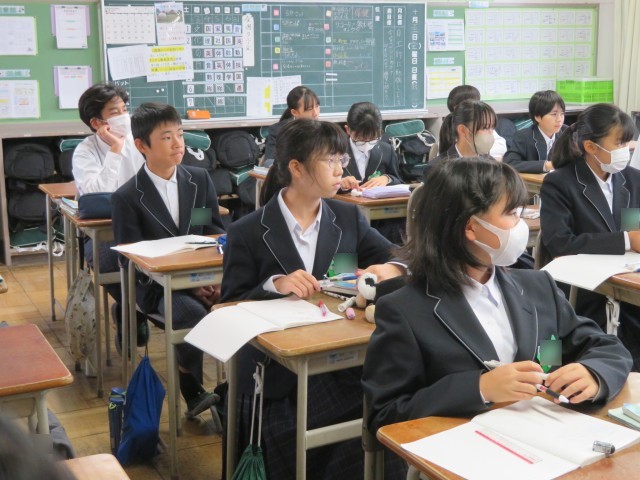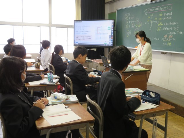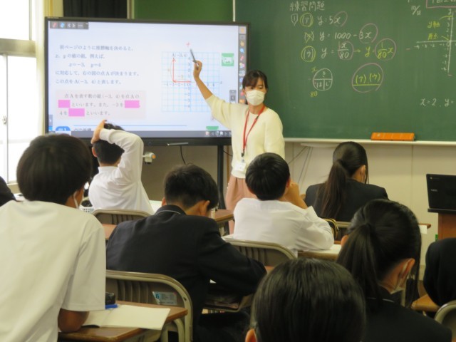 1年生の数学の授業のようすです。「平面上の点の位置を表す方法を考えよう」というめあてで学習を進めていました。x軸、y軸、座標軸、原点など新しい言葉も覚えることができましたね。