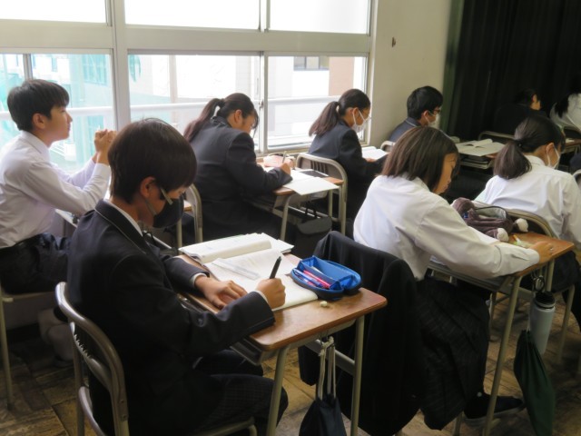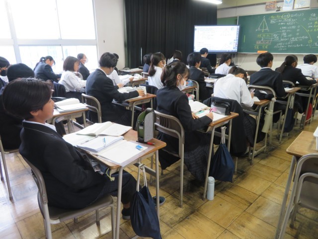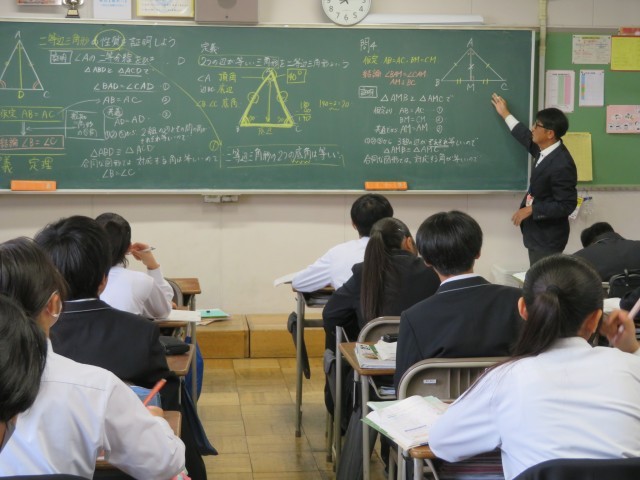 2年生の数学の授業のようすです。「二等辺三角形の性質を証明しよう」というめあてで学習を進めていました。三角形の合同を利用して、二等辺三角形の性質がいつでもいえることを明らかにすることができましたね。