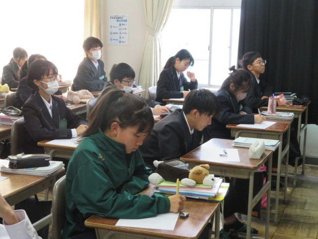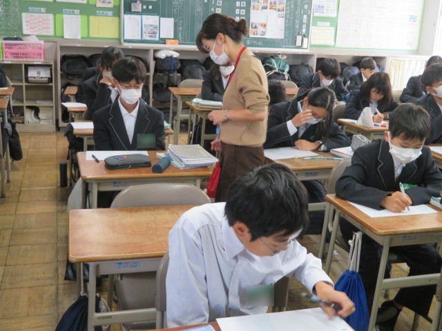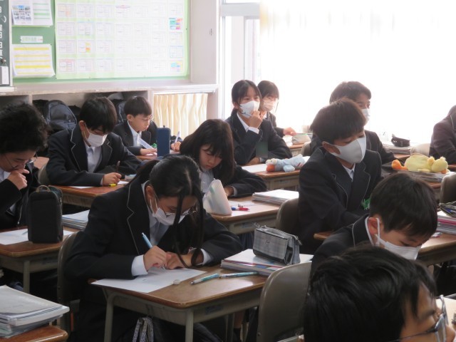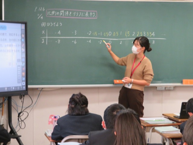 1年生の数学の授業のようすです。「比例の関係をグラフに表そう」というめあてで学習を進めていました。小学校の算数の学習と比べて、どんな違いがあるか説明できたかな?