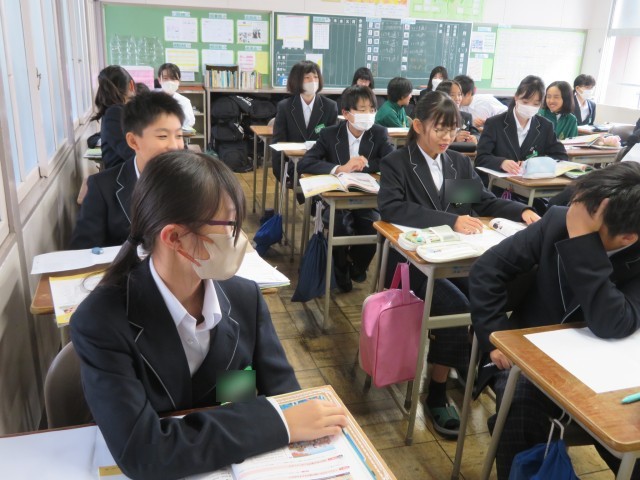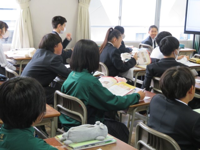 1年生の英語の授業のようすです。「現在進行形の復習をしよう」というめあてで学習を進めていました。現在進行形のつくり方について自信を深めることができましたね。