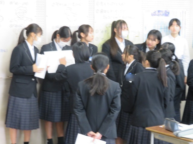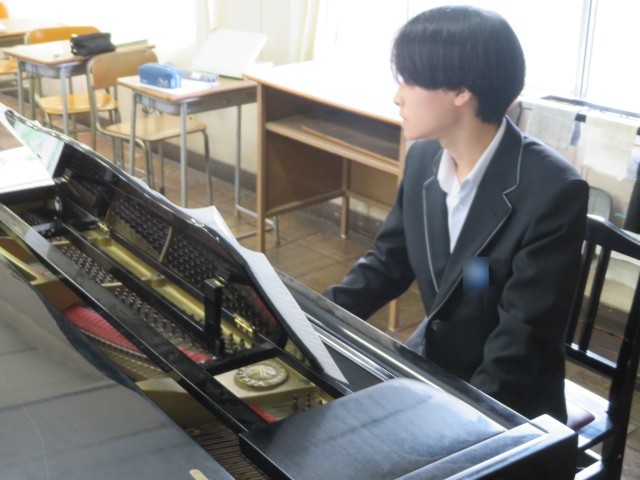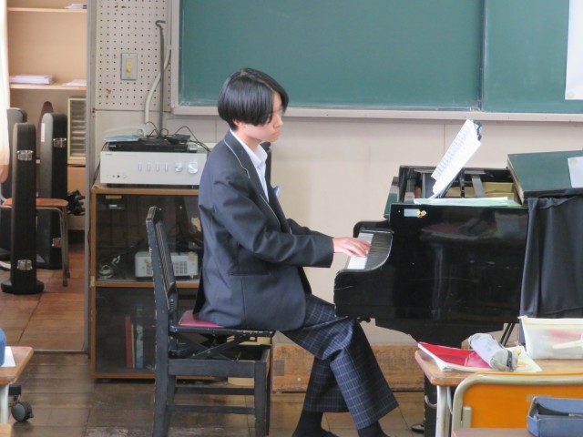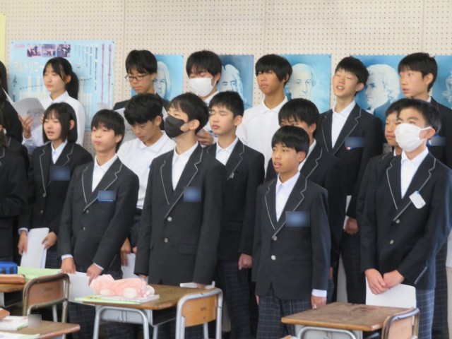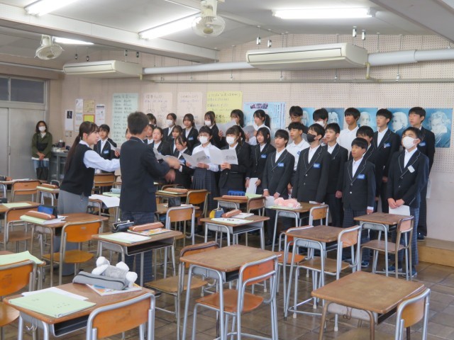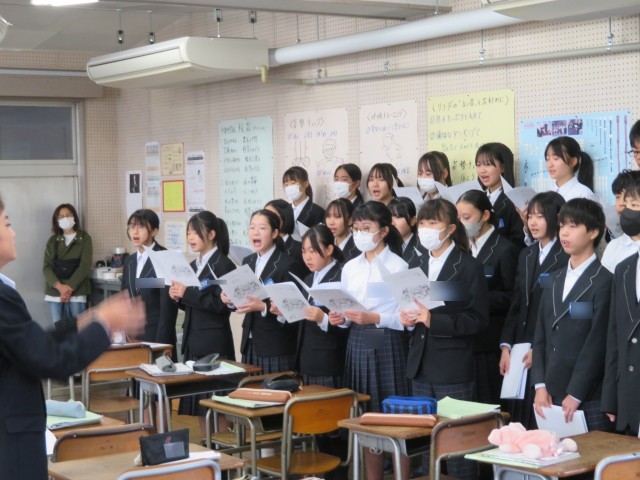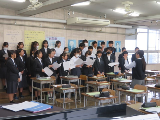 2年生の音楽の授業のようすです。クラス合唱曲「カイト」のエンディングの表現について、どのように強弱をつけていくとよいか話し合いをしながら歌って試していました。思いを伝えるためにどのように表現するとよいかみんなで考えて合唱を作り上げています。