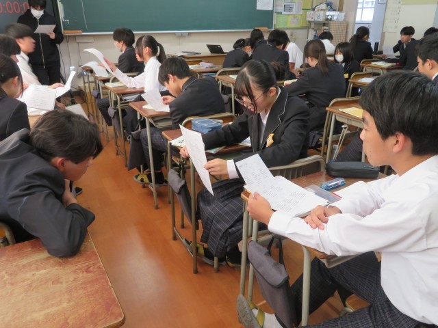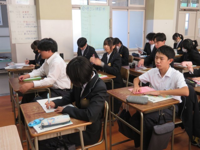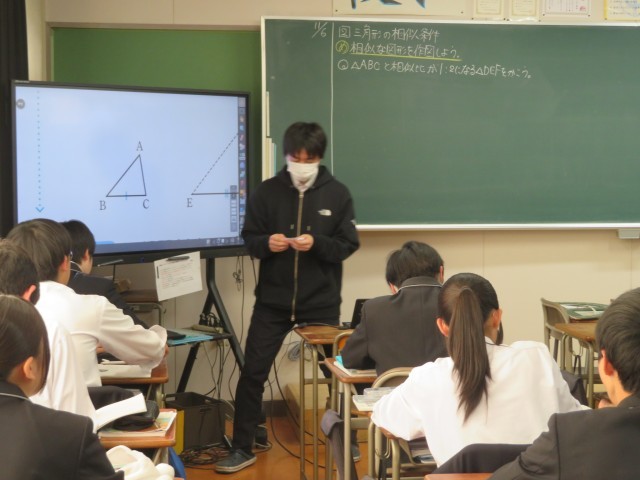 3年生の数学の授業のようすです。「相似な図形を作図しよう」というめあてで学習を進めていました。合同な図形の作図のことを思い出して比較しながら理解を深めることができましたね。