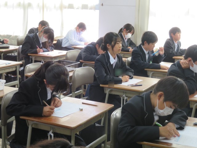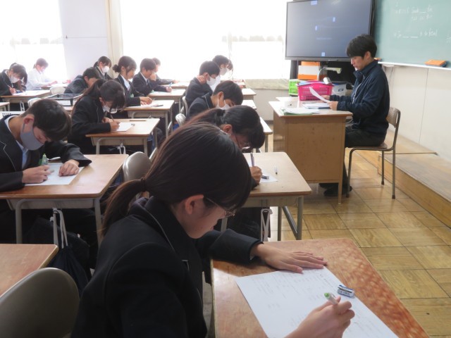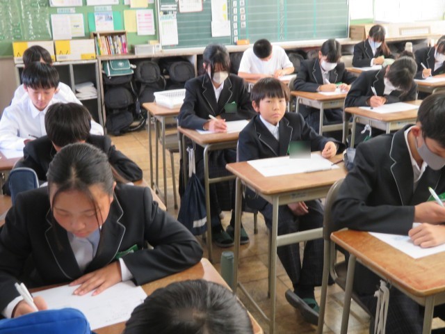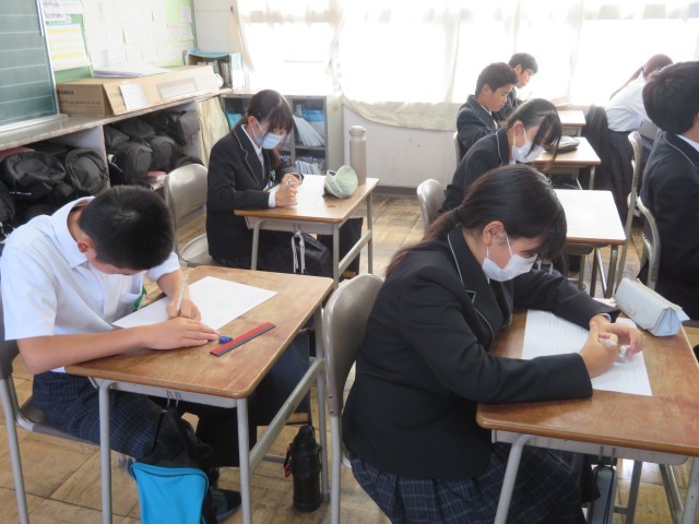 1年生の英語の授業のようすです。「単語や表現のまとめをしよう」というめあてで、これまで学んだことを確認するプリントに挑戦していました。学習の定着度がわかったので、できたところは自信にし、不確かだったところはしっかりと復習していこうね