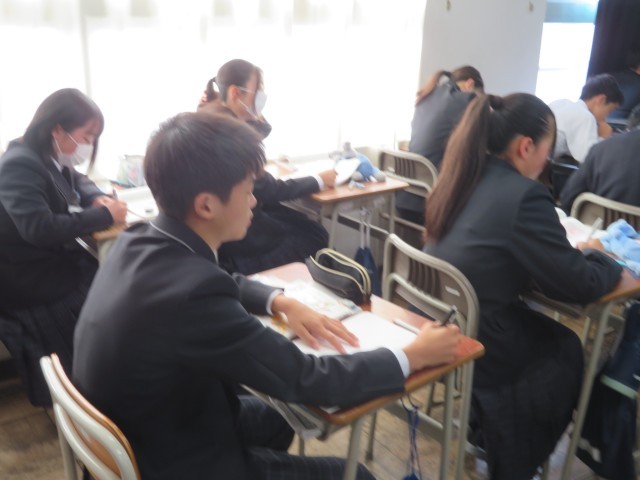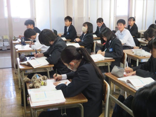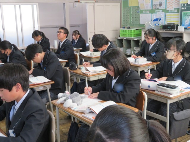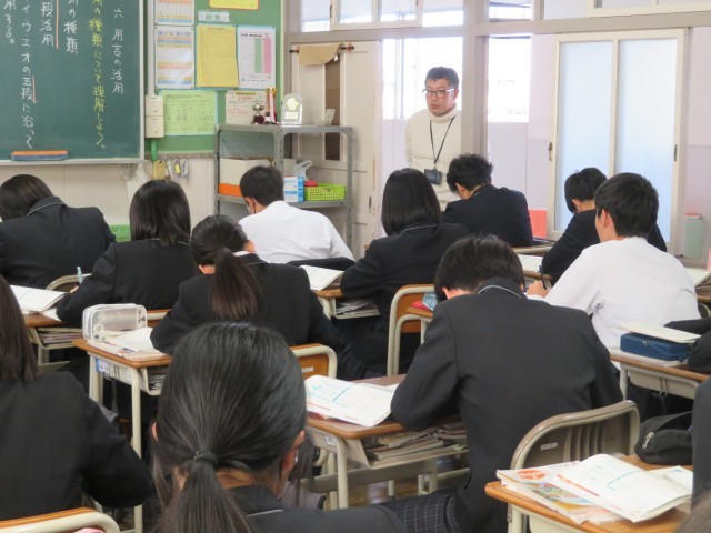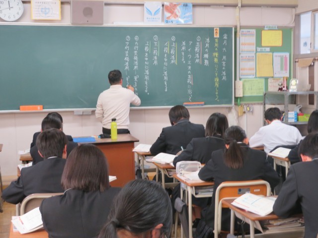 2年生の国語の授業のようすです。「活用の種類について理解しよう」というめあてで、五段活用や上一段活用、下一段活用、カ行変格活用、サ行変格活用について学んでいました。どんな特徴があるか、説明できるようにがんばろうね(^^)/