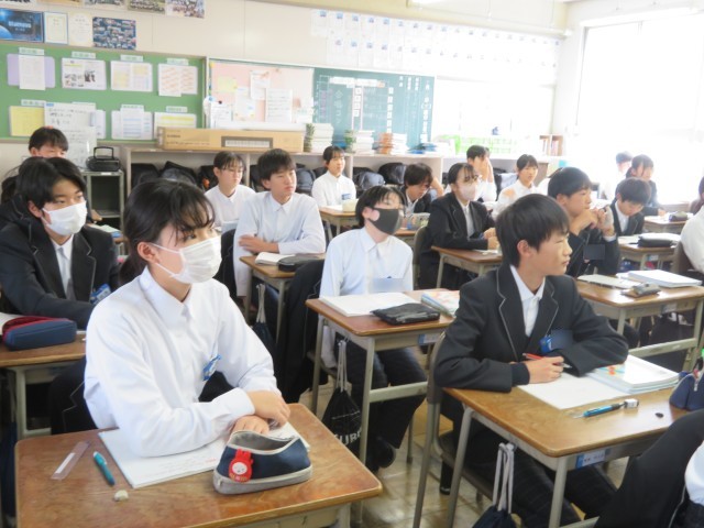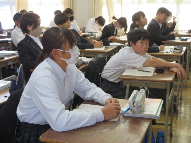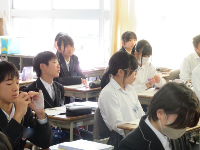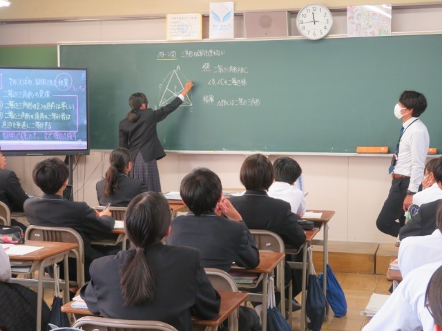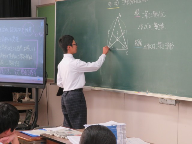 2年生の数学の授業のようすです。これまでの図形の証明は、三角形の合同を使って行ってきましたが、今日は「三角形の合同を使わない」をめあてにして証明を考えました。さあ、どんなふうに筋道を立てて考えていくことができたかな。