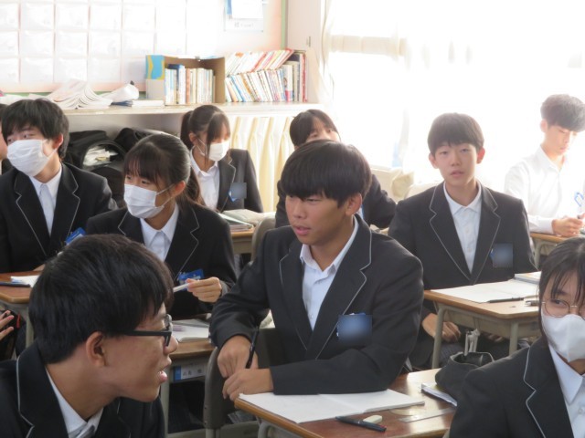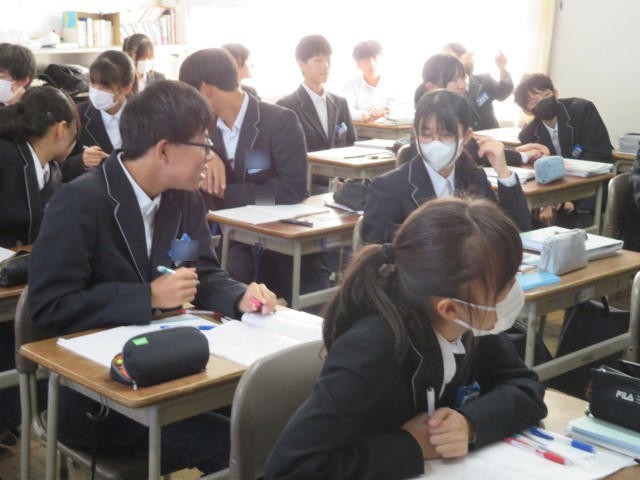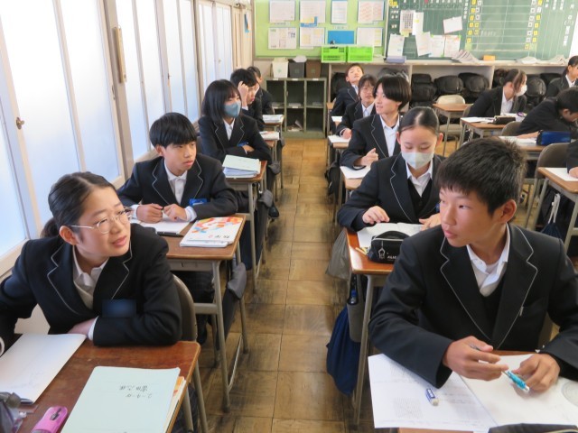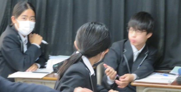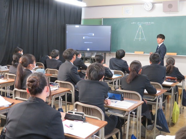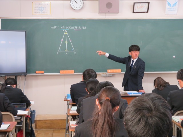 2年生の数学の授業のようすです。「△ABCで、∠B=∠Cならば、AB=ACである」ことを証明していました。証明するために、∠Aの二等分線と辺BCとの交点をDにする補助線を引いて考えました。うまく道筋を立てることができたかな。