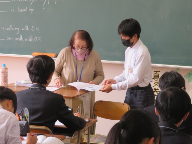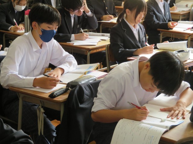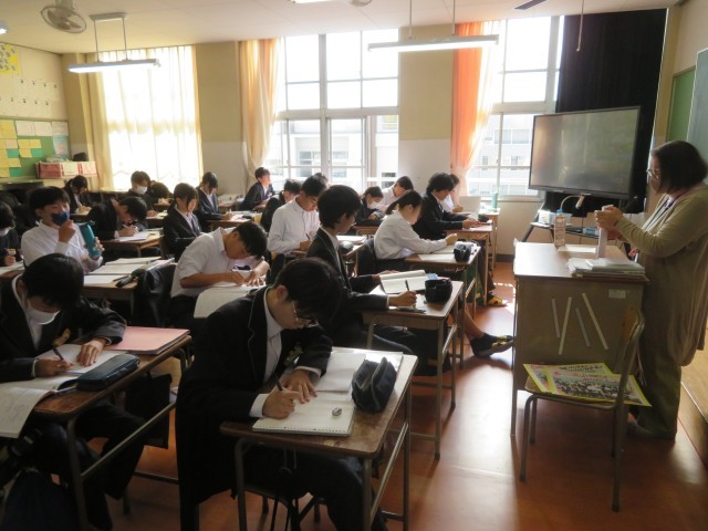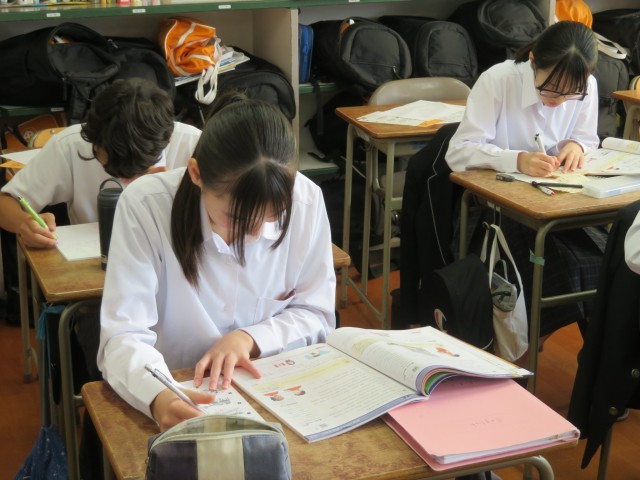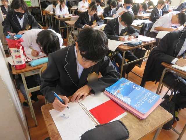 3年生の英語の授業のようすです。テストに向けて、これまで学んだことをプリントや問題集を使って復習していました。とても集中して取り組むことができていましたね。