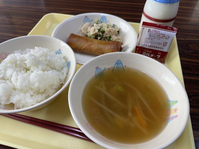 今日の給食のメニューは、ご飯、牛乳、春巻、バンバンジー、豆腐の中華スープ、ココアパウダーでした。