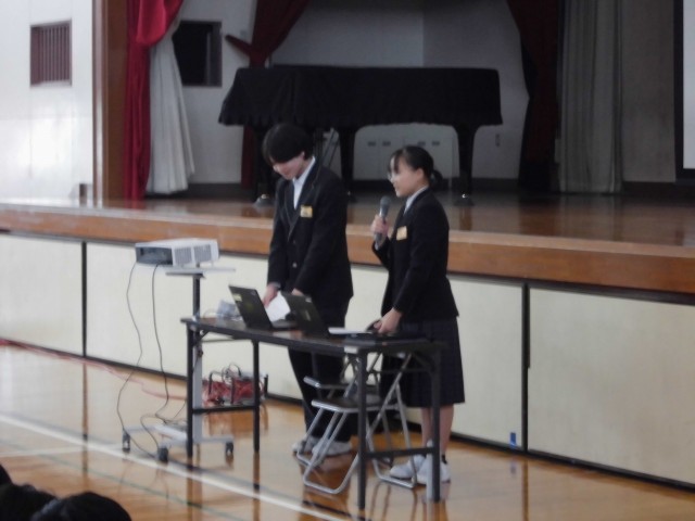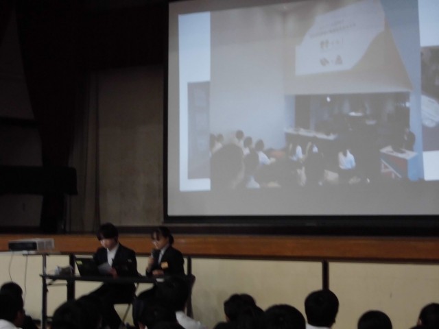 本日集会の後に、未来リーダー発表会が行われました。未来リーダーに参加した二人は夏休み前から準備をし、事前学習の様子や、夏休みに沖縄で学んだことを発表しました。また、平和についても学び、中部中学校にある敷地の壁は戦争の名残りが残されていることをスライドで発表し、話を聞いた生徒たちはとても関心をもっている様子でした。
