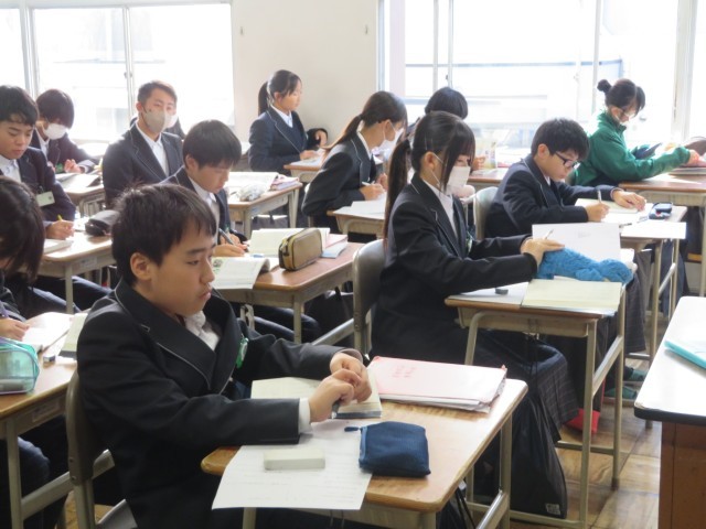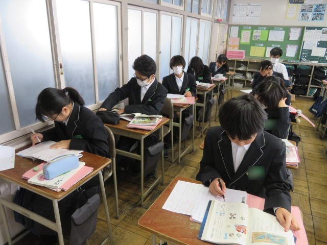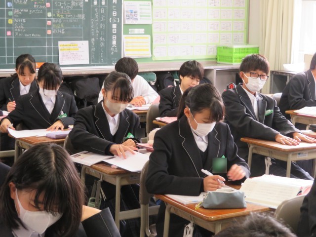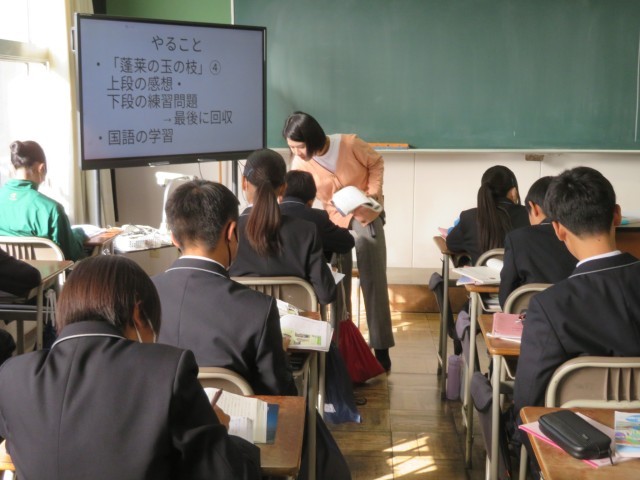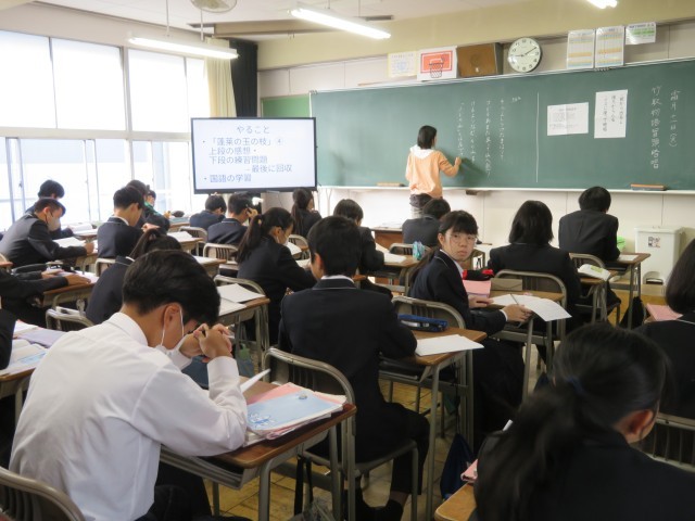 1年生の国語の授業のようすです。前半の時間では「竹取物語の冒頭暗唱をしよう」というめあてで暗唱に挑戦しました。うまく唱えることができたかな。