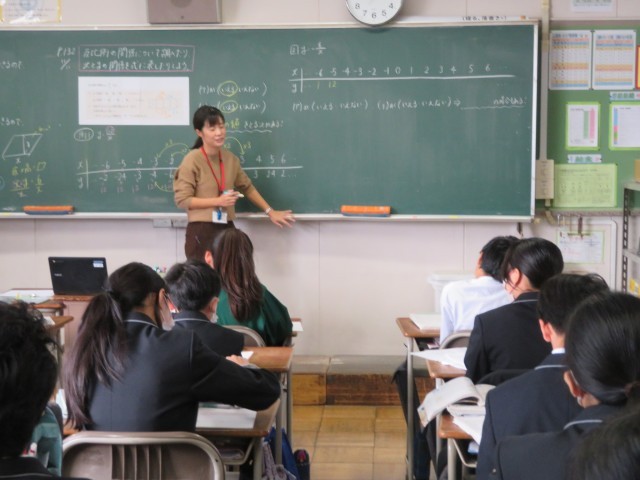 1年生の数学の授業のようすです。「反比例の関係を調べたり、xとyの関係を式に表したりしよう」というめあてで学習を進めていました。「反比例ってなあに?」と聞かれたら、うまく説明できるかな。