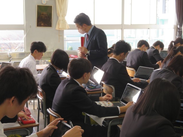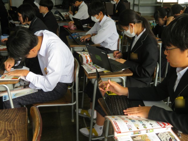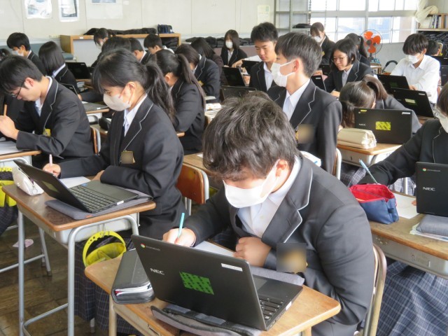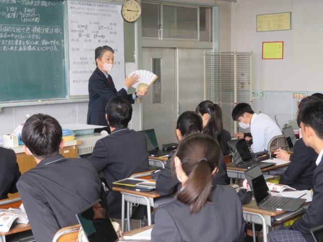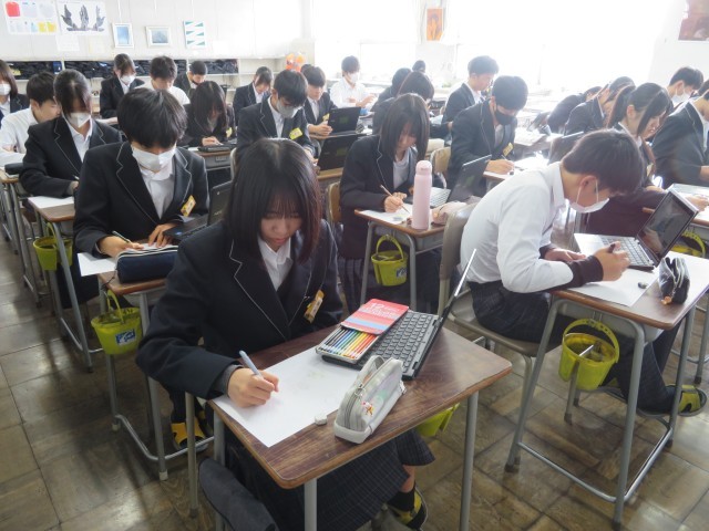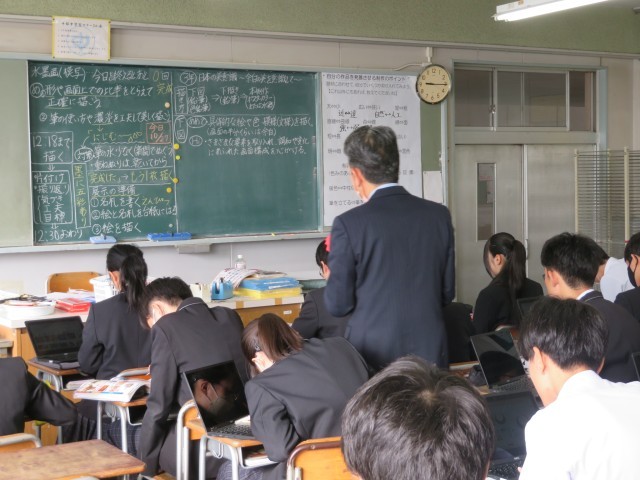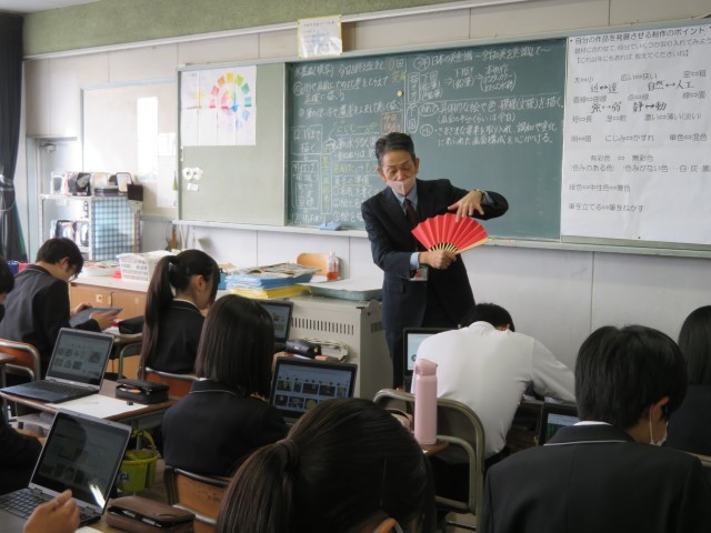 3年生の美術の授業のようすです。「日本の美意識~余白の美を意識して~」をテーマに扇子の絵付けに挑戦していました。どんな下絵にしようかじっくり考えながら鉛筆を運んでいましたね。