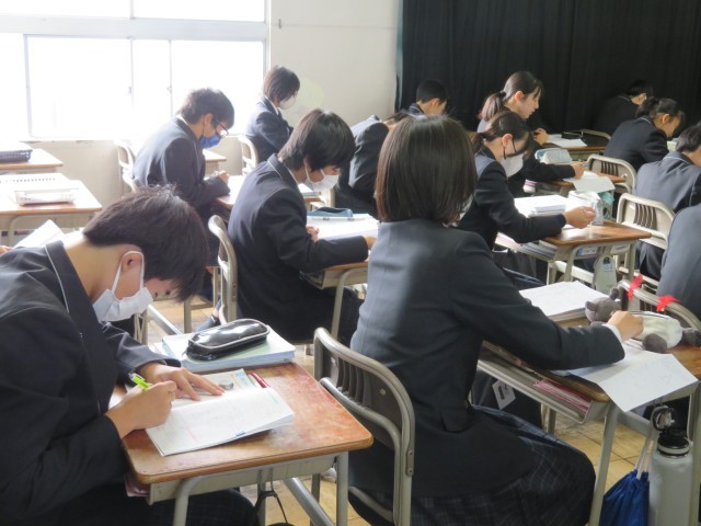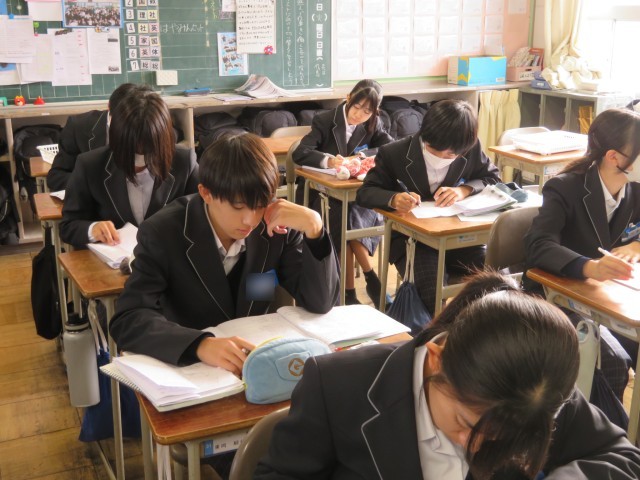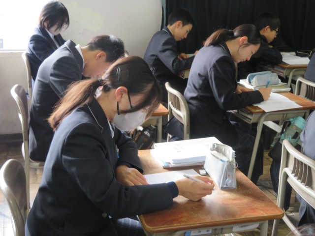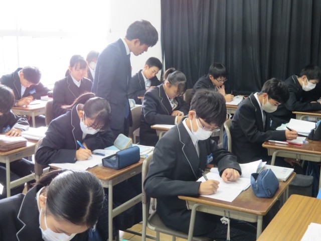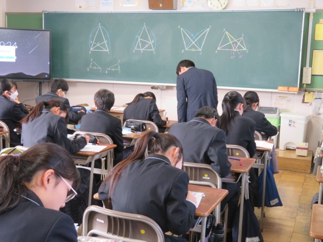 2年生の数学の授業のようすです。重なった図形の中にできる等しい辺や角について、合同な三角形を使って証明する問題に挑戦していました。