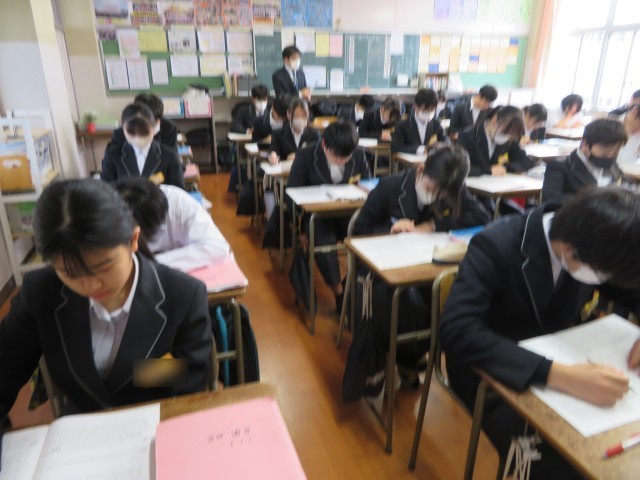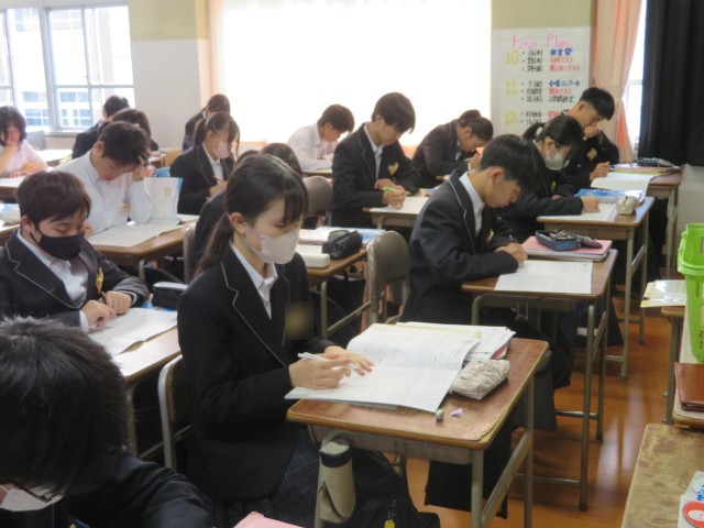 3年生の英語の授業のようすです。「並べかえでストーリーを完成させる」プリントに挑戦していました。