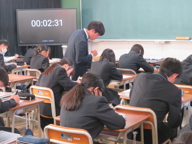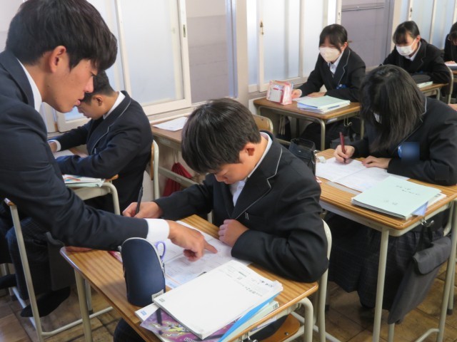 2年生の数学の授業のようすです。図形の角度を求める問題に挑戦していました。先生がぐるぐる教室を回って声かけをしてくれていました。不確かだったところを先生に質問してスッキリすることができましたね。