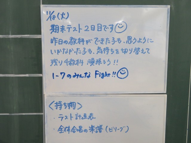11月18日(火) 気持ちを切りかえてがんばれ!【1年黒板メッセージ】