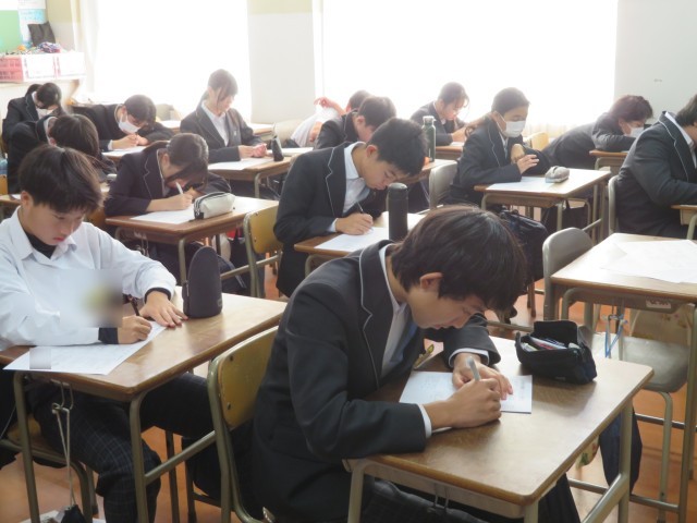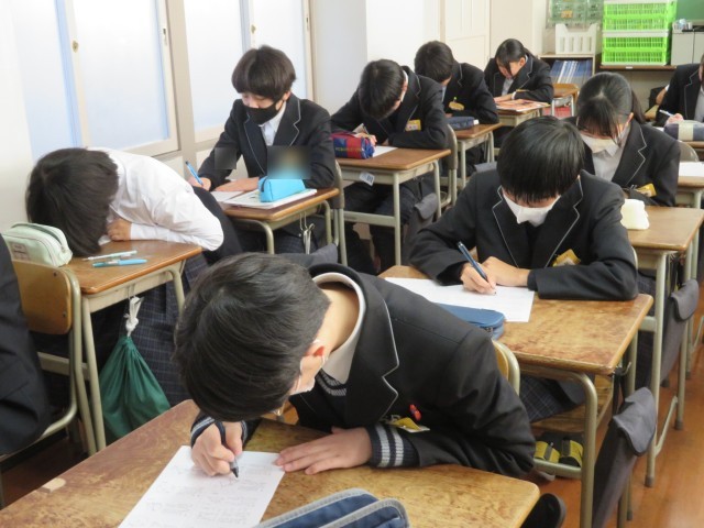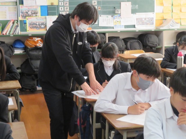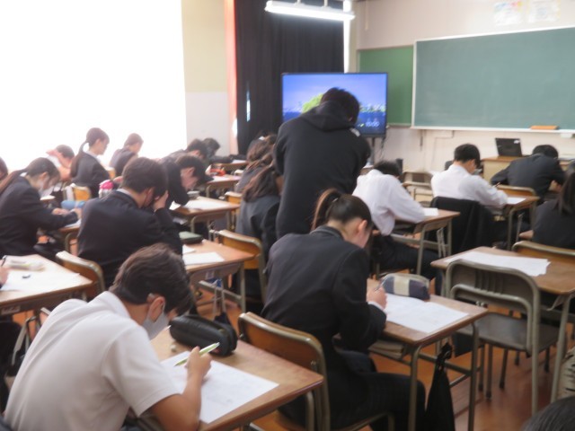 3年生の数学の授業のようすです。平面図形の角度を求める入試問題に挑戦していました。たくさん問題を解いて、入試問題に慣れていこう!