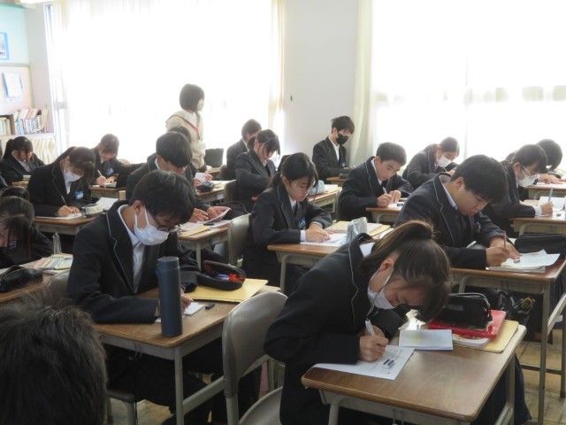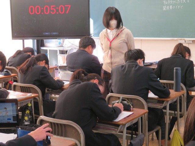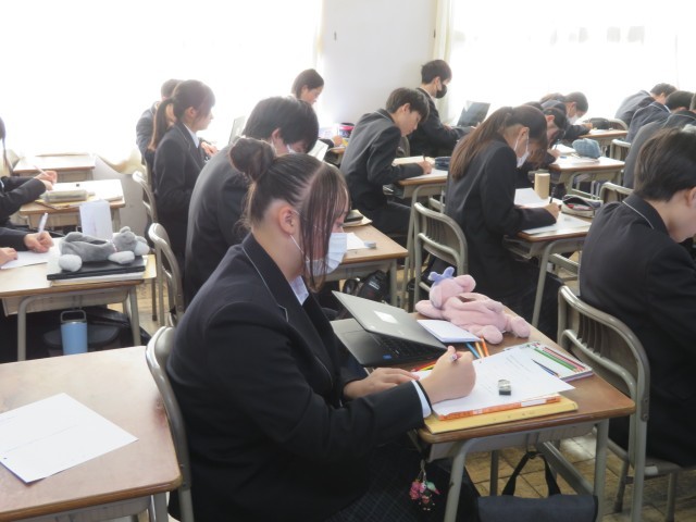 2年生の家庭科の授業のようすです。「絵本作りを振り返ろう」というめあてで、「幼児の興味を引くための工夫」「幼児に伝えたいこと・学んでほしいこと」など、どんな思いで絵本作りに取り組んできたかについてまとめていました。すてきな手作り絵本ができましたね。