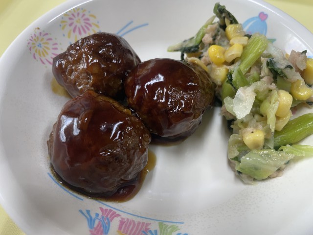 今日の給食のメニューは、わかめご飯、牛乳、肉団子、塩だれサラダ、けんちん汁でした。