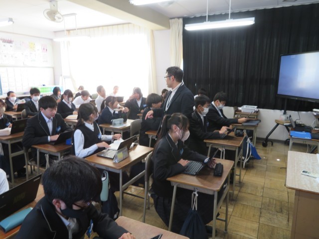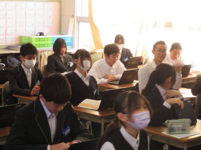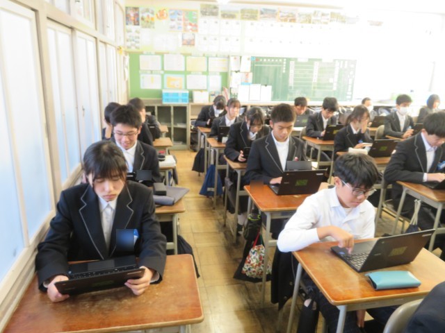 2年生の国語の授業のようすです。文法について力試しをするために、クロムブックを使って問題演習に取り組んでいました。たくさん問題を解いて自信を深めることができましたね。