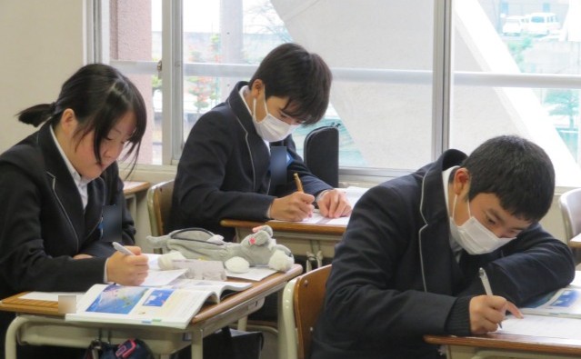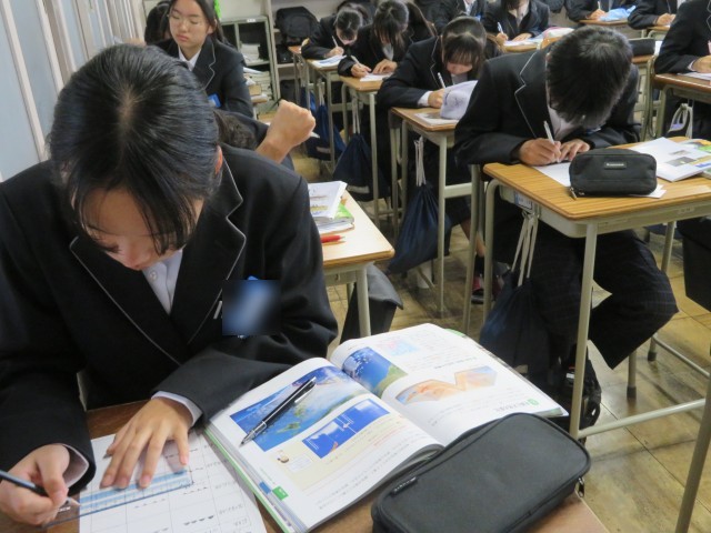 2年生の理科の授業のようすです。「前線とは何だろう?」というテーマで学習を進めていました。友だちに説明できるように頑張りましたね。