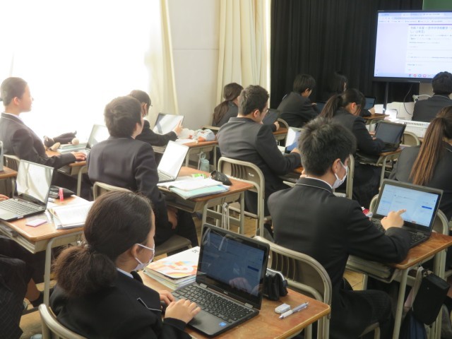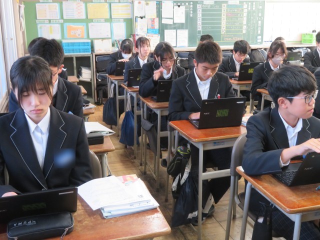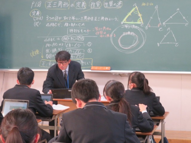 2年生の数学の授業のようすです。正三角形の定義や性質について学んでいました。性質は、これまで学んだ二等辺三角形の性質などを使って、いつでもいえることを証明することができましたね。