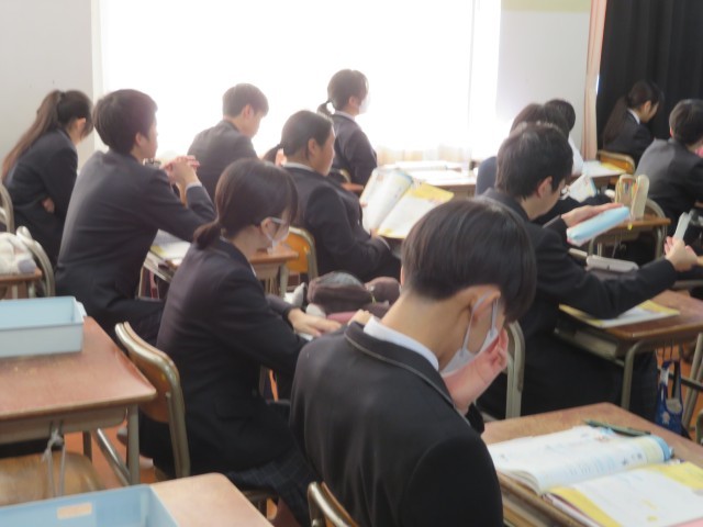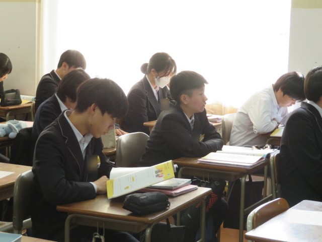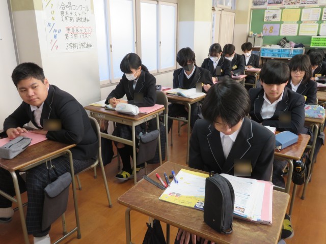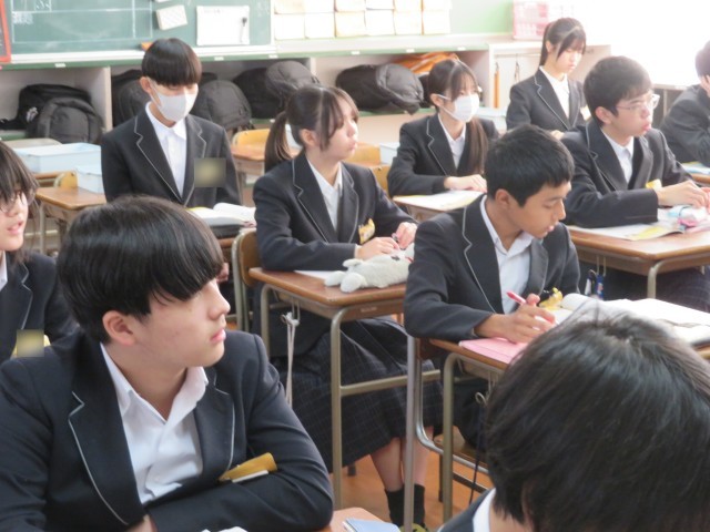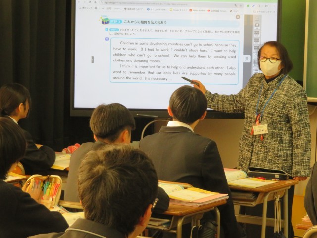 3年生の英語の授業のようすです。英語の授業を通して、多様な文化や社会が抱える問題について学んできました。「地球市民としての抱負を伝えあおう」というめあてで学習を深めていました。