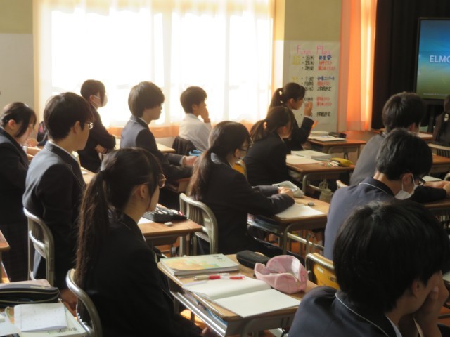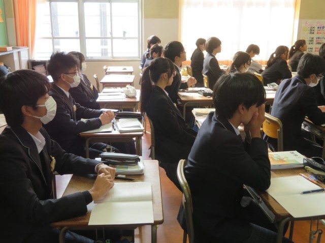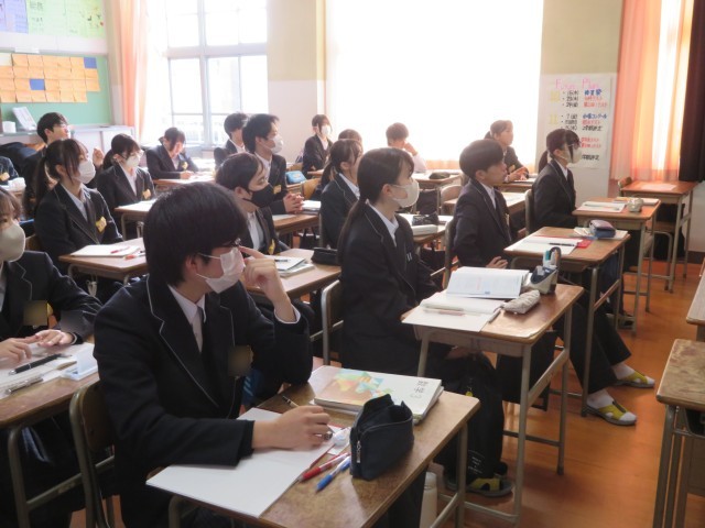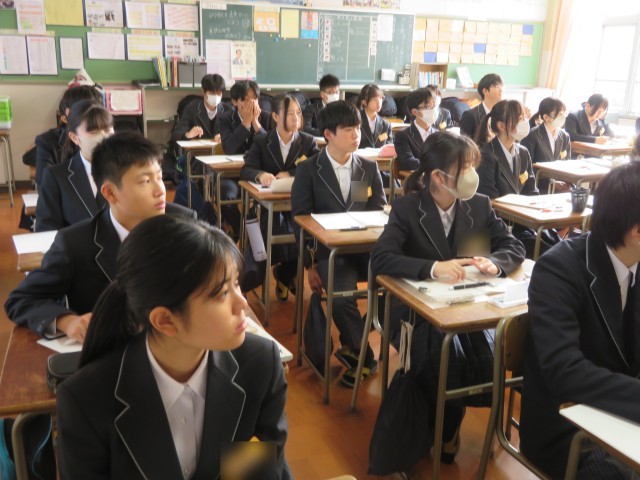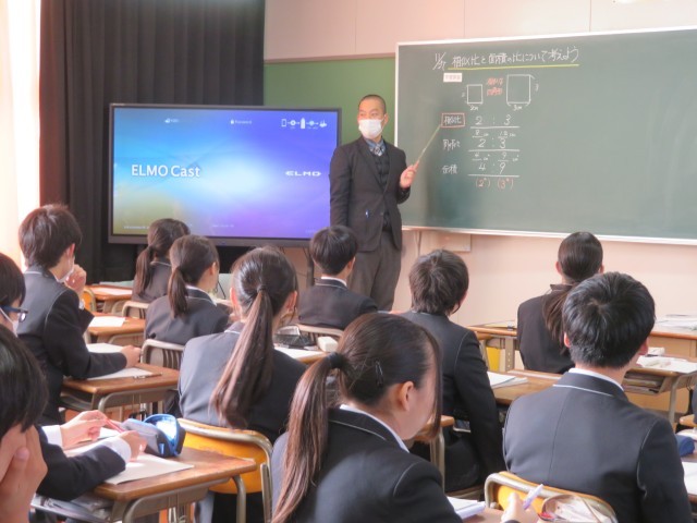 3年生の数学の授業のようすです。「相似比と面積比を考えよう」というめあてで学習を進めていました。相似な図形について、相似比と面積比にどのような関係があるのか意見を出し合っていました。