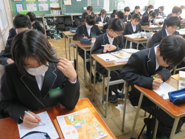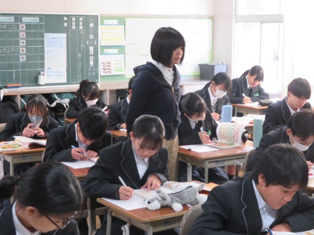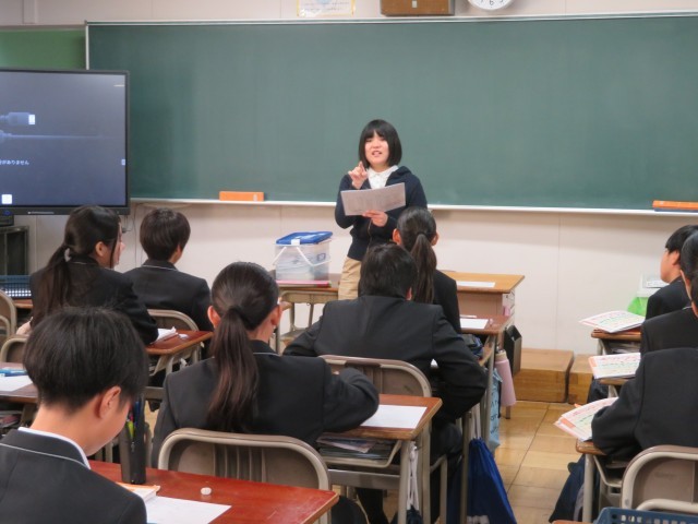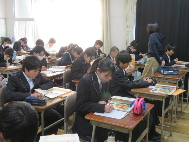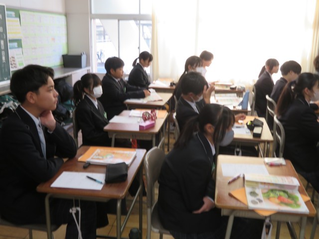 1年生の家庭科の授業のようすです。「何をどのくらい食べるとよいか考えよう」というめあてで学習を進めていました。1回の食事の中で6つの食品群をすべてそろえようとしたとき、足りない群は何か、また、どのように補うとよいか考えたことを伝えあいました。