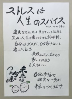 サポートルームの先生からのメッセージです。3年生は12月の保護者会でいよいよ私学・専修学校の受験校が決まります。2学期の評定は確定しましたが、実力はまだまだこれからぐんぐん伸ばすことができます。未来は今のつみ重ねですね。プレッシャーがストレスに感じるかもしれませんが、ストレスのない人生はありません。まだまだできる。がんばるみなさんを心より応援しています!