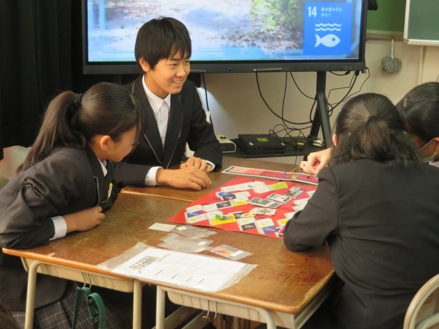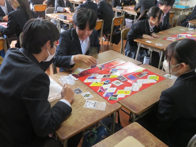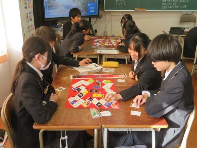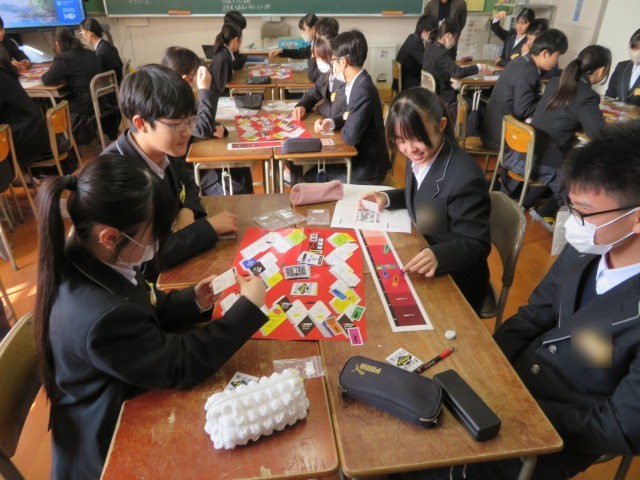 3年生の家庭科の授業のようすです。「服ができるまでにどれくらいの人がかかわっているのか考えよう」というめあてで学習を進めていました。授業の後半では「悪質商法対策ゲームⅡ」をつかってグループで楽しみながら対策を学びました。