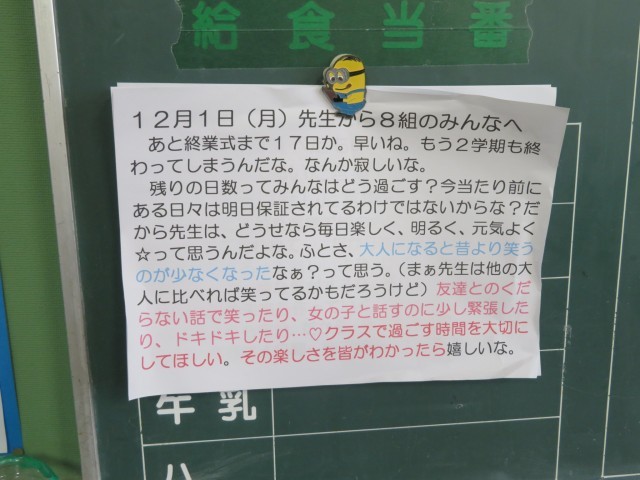 12月2日(火) 楽しく、明るく、元気よく【1年黒板メッセージ】