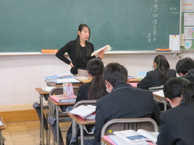 1年生の国語の授業のようすです。「『不便』の価値を見つめなおすを読んで初読の感想をもとう」というめあてで学習を進めていました。どんなことが印象に残ったかな。