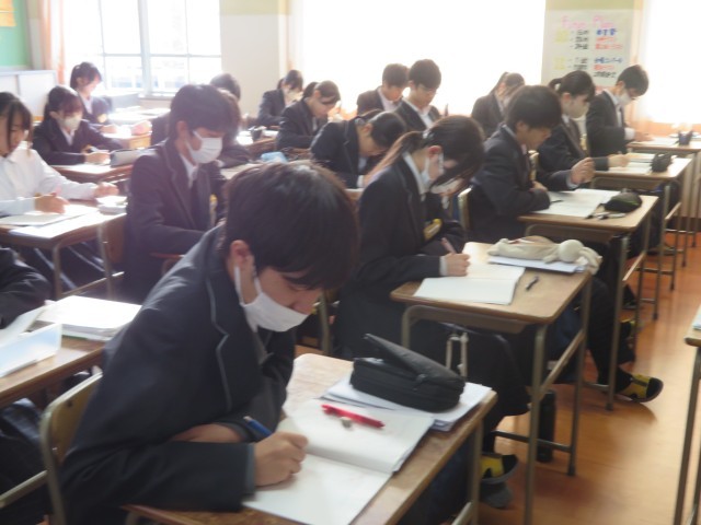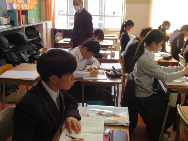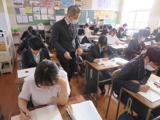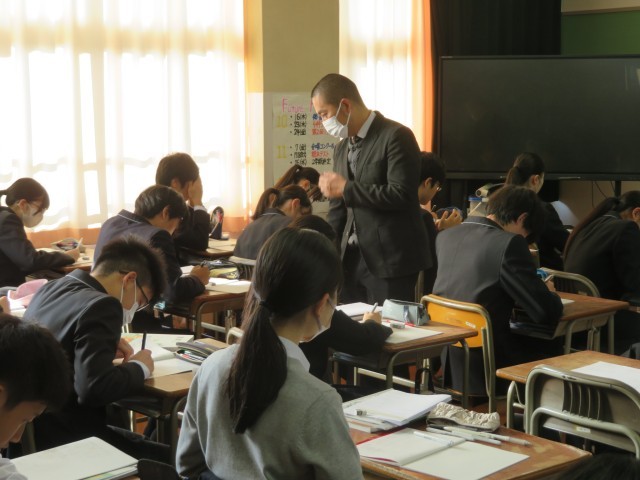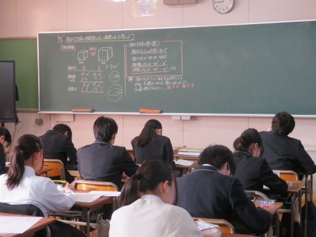 3年生の数学の授業のようすです。「相似な立体の表面積比や体積比について考えよう」というめあてで学習を進めていました。相似な平面図形のときの考えを使って、表面積比や体積比についてどんなことが言えるのか説明することができたかな。