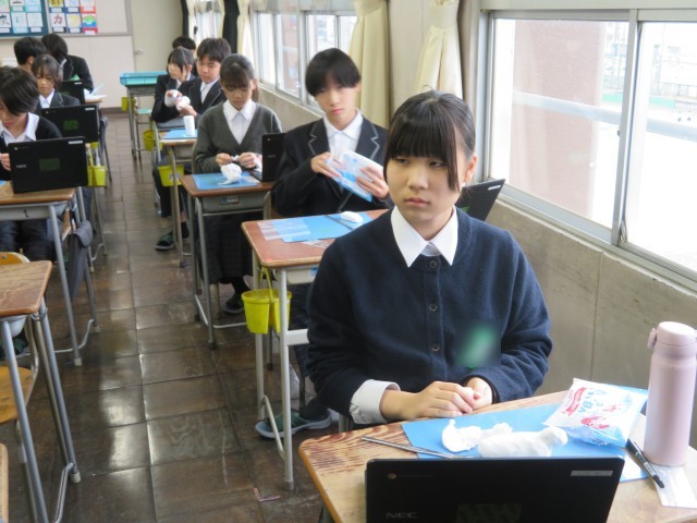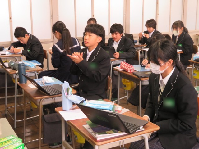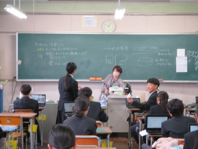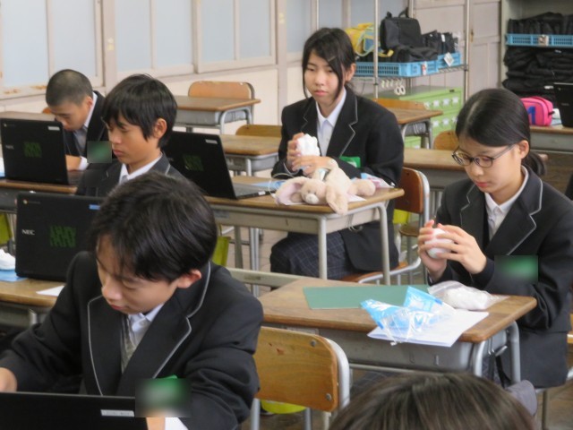 1年生の美術の授業のようすです。1年生は「そのものらしさを形にして」というテーマに「粘土や絵の具や材料などの特徴を生かしながら制作しよう」というめあてで作品づくりに取り組んでいます。