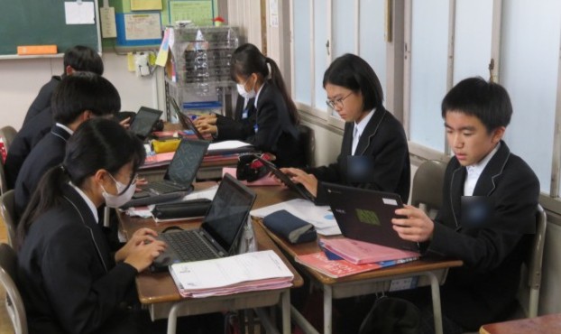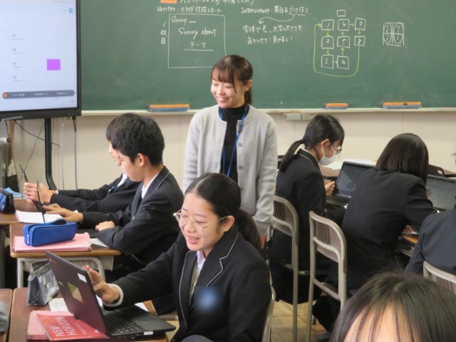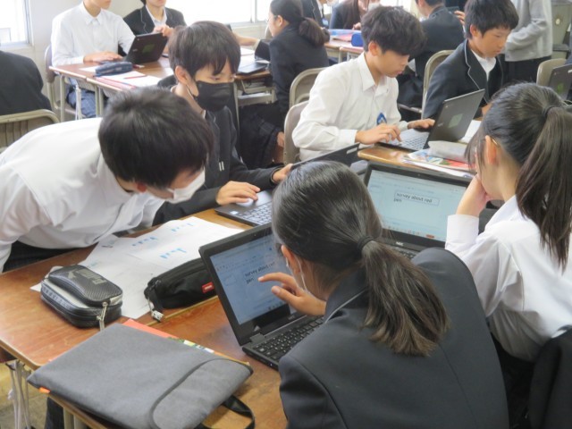 2年生の英語の授業のようすです。自分で調べたいことをクラスの友だちに英語で質問しながらデータをまとめ、英語でプレゼンすることに挑戦しています。どんな結果を発表してくれるのか楽しみですね。