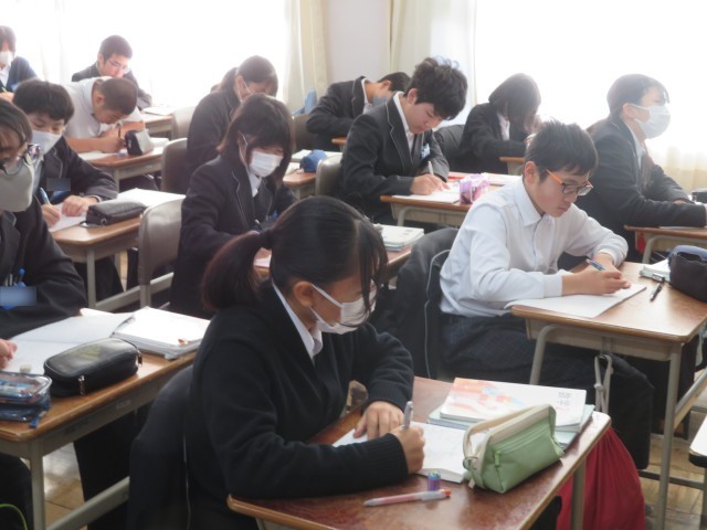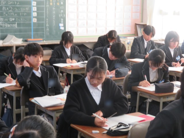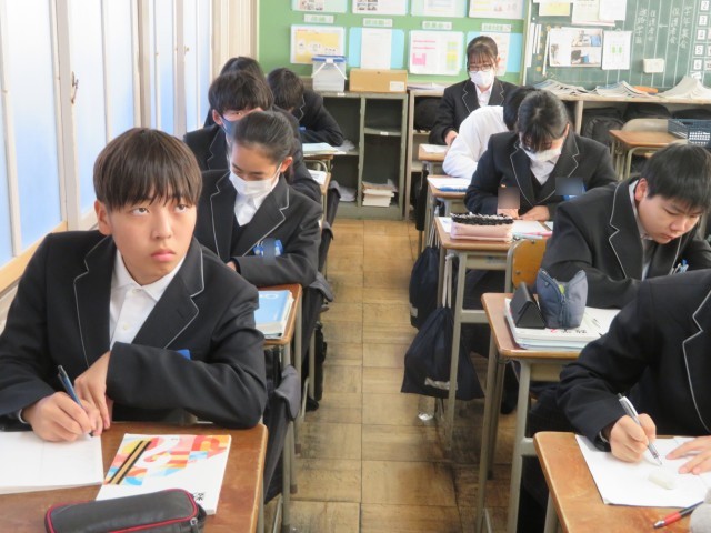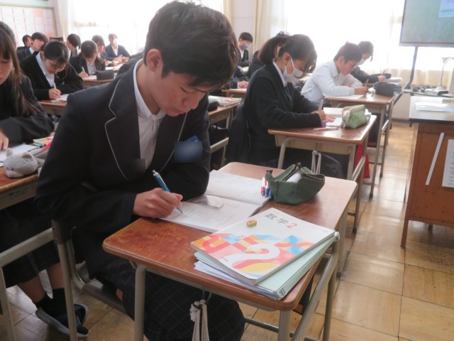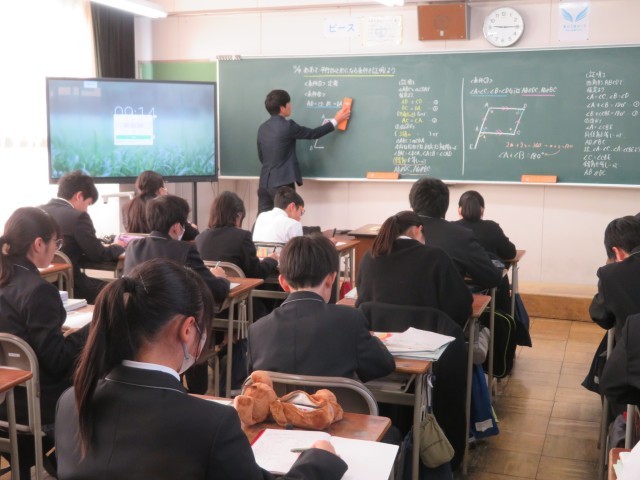 2年生の数学の授業のようすです。「平行四辺形になる条件を証明しよう」というめあてで学習を進めていました。四角形にどんな条件を加えると必ず平行四辺形になるのか、今まで学んだ図形の性質を生かして説明することができましたね。